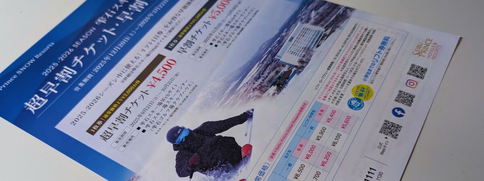 2025-2026SEASONの雫石スキー場では、通常価格より\2,000お得な超早割チケット\4,500を9月21日(日)から10月31日(金)まで、通常価格より\1,500お得な早割チケット\5,000を11月1日(土)から12月19日(金)まで販売しております。